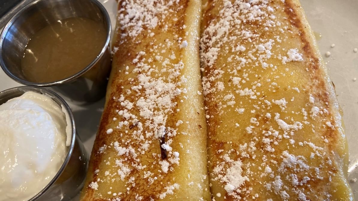 A crêpe filled with our special blend of cheeses and grilled golden brown. Served with sour cream and sweet strawberry preserves or applesauce.