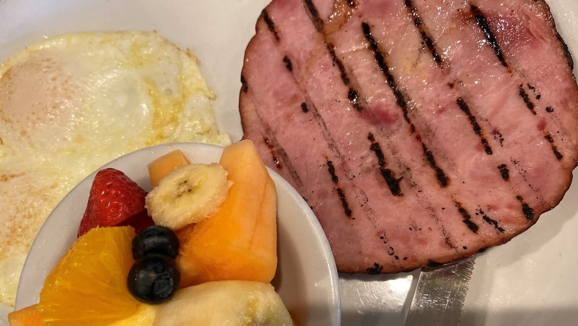Three large eggs any style, ham steak, two thick-cut bacon strips and two sausage links or two sausage patties.