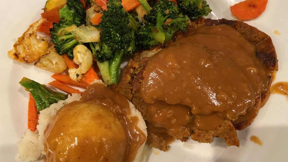 Our family’s blend of Angus beef ground beef and spices, smother in brown gravy, served with mashed potatoes and grilled vegetables