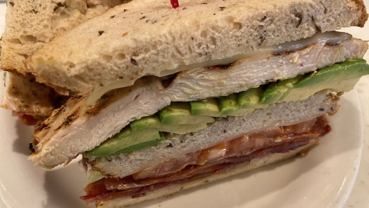 Chicken breast, bacon, avocado, lettuce, tomato and Swiss cheese on a French roll.