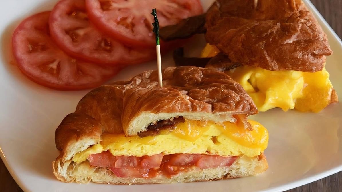 Scrambled egg, cheddar cheese and tomato with your choice of bacon, sausage or ham on a croissant, bagel or toast.